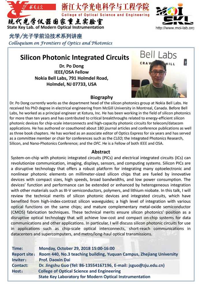关于美国贝尔实验室Po Dong博士学术报告的通知